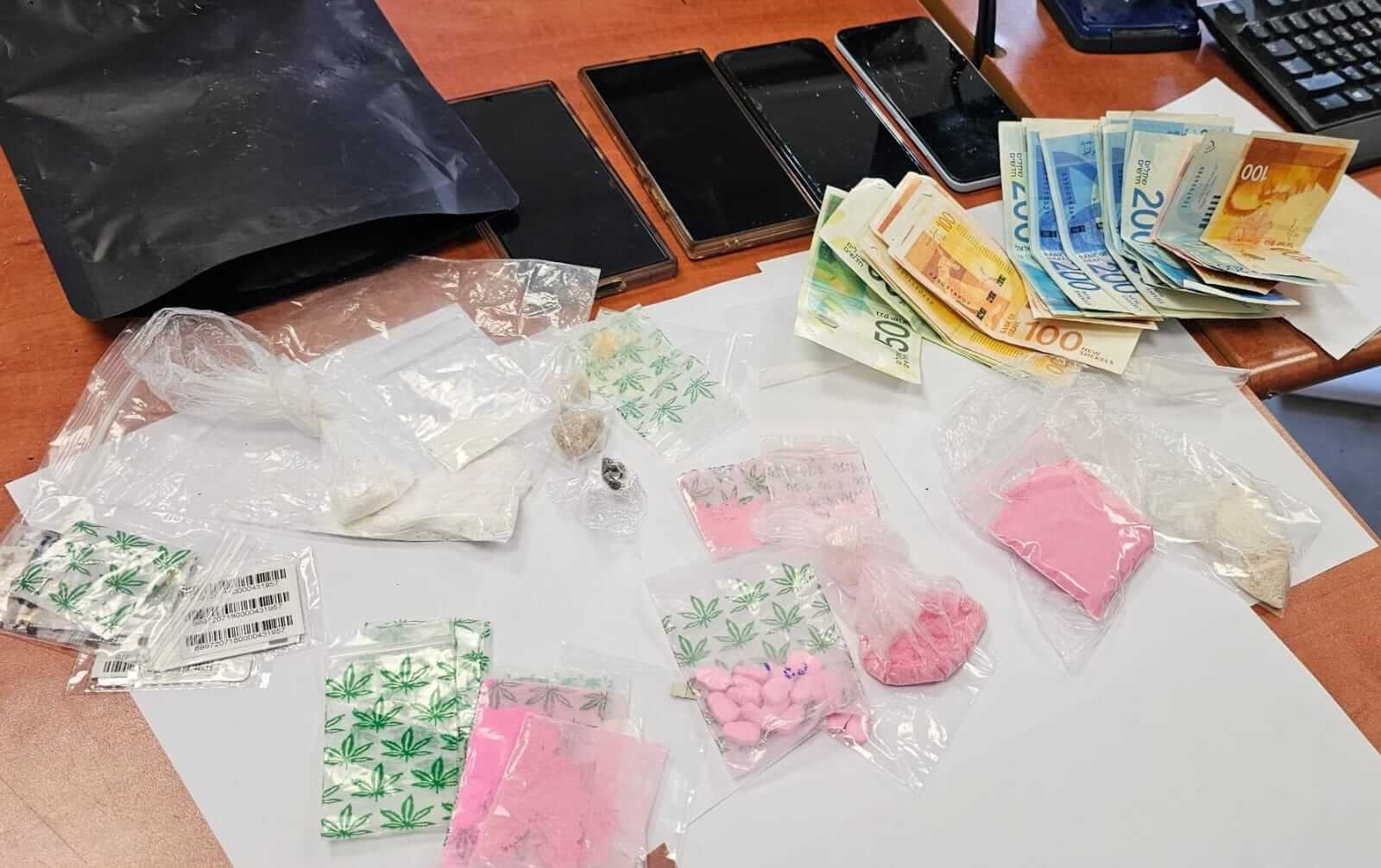 במהלך החיפוש תפסו השוטרים בדירה חומרים החשודים כסמים מסוכנים: דוסה- 52 גרם, קוקאין- 21 גרם, חשיש- 1.16 גרם, בולים- 76, 2 גושים חומים- 11 קנאביס- 44 גרם. כמו כן נתפסו 5 פלאפונים, 5 כרטיסי SIM, כסף מזומן בסך 5,400₪.